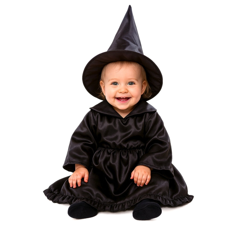 Le costume Halloween Petite Sorcière Perticara pour bébés contient : Robe, chapeau | Cette tenue bébé horrifiante imitant un Petite Enchanteresse est disponible en taille unique