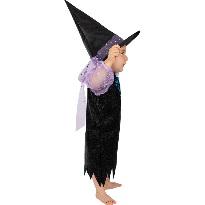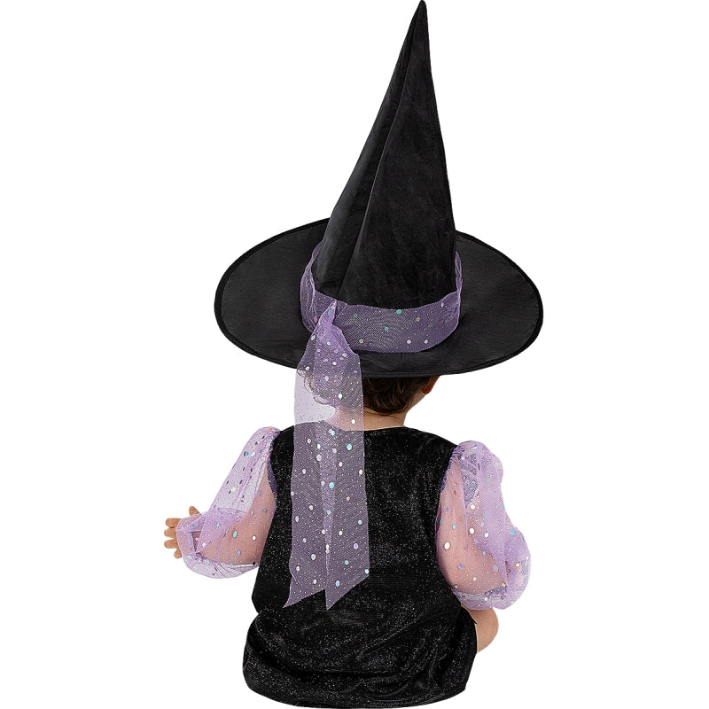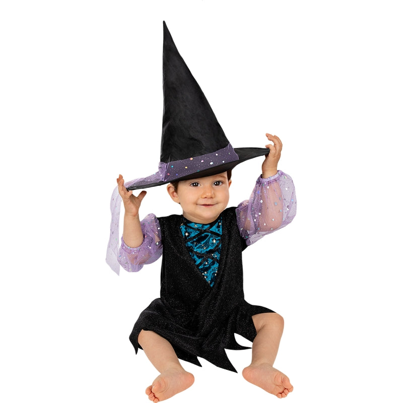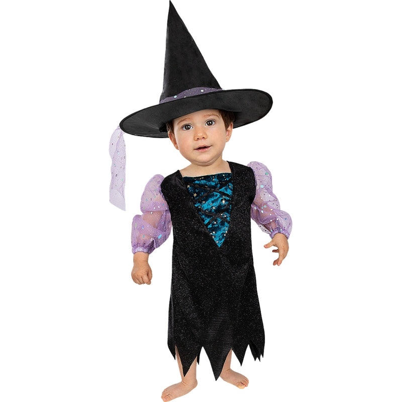 Le costume terrifiant pour bébés de Petite sorcière scintillante comprend : Robe et chapeau | Cette tenue de bébé exclusive, imitant un Ensorceleuse brillante, est disponible dans 4 tailles différentes.