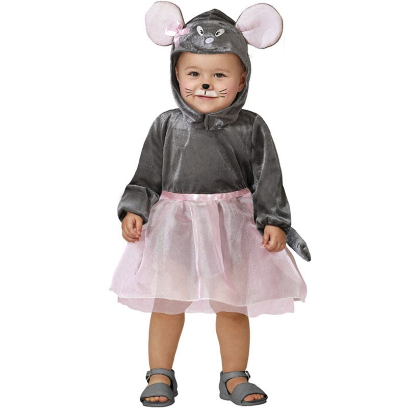 Le costume original Petite souris avec tutu pour bébés contient : grenouillère avec queue, jupe et capuche | Cette tenue bébé imitant petite souris grise avec jupe rose est disponible en 3 tailles différentes
