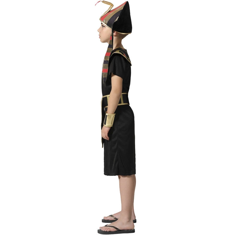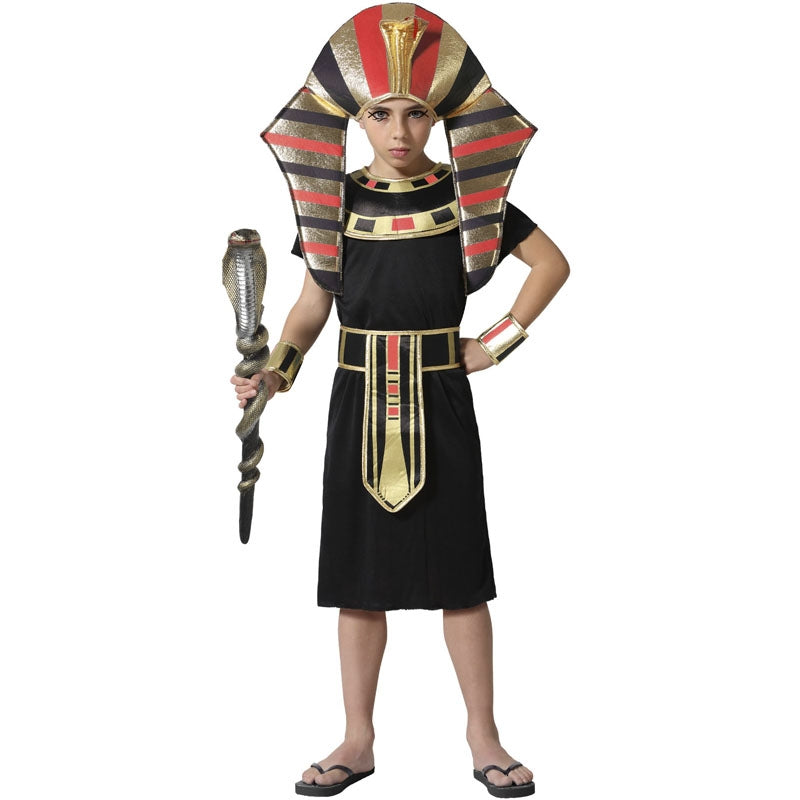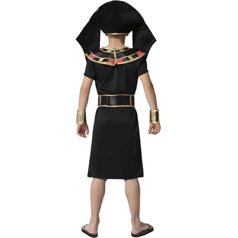 Le costume original Pharaon noir et or pour garçons contient: coiffe, tunique, ceinture et bracelets | Cette tenue garçon imitant un égyptien noir et or est disponible en 4 tailles différentes