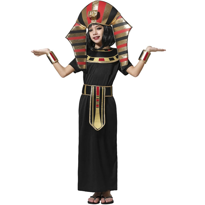 Nous avons tout ce qu'il faut pour transformer votre fille en Pharaonne noire et dorée d'une manière super originale et accrocheuse grâce à ce nouveau costume pour filles. Si votre fille vous demande sans cesse de l'habiller en pharaonne d'Égypte vous êtes sûre de réussir avec ce nouveau costume de carnaval pour filles. Composé de coiffe, robe, ceinture et bracelets et disponible en 4 différentes tailles pour convenir à tous les âges. Nous ne doutons pas que l'idée du nouveau déguisement de fille Pharaonne noire et dorée lui permettra d'être spectaculaire lors d'un défilé de carnaval, d'un goûter costumé avec ses amies, des fêtes de fin d'année à l'école ou tout simplement en jouant à la maison habillée en imaginant être égyptienne en noir et or imitant son look de manière réaliste. Achetez ce déguisement Pharaonne noire et dorée fille original de fille confortablement depuis chez vous dans notre boutique en ligne.