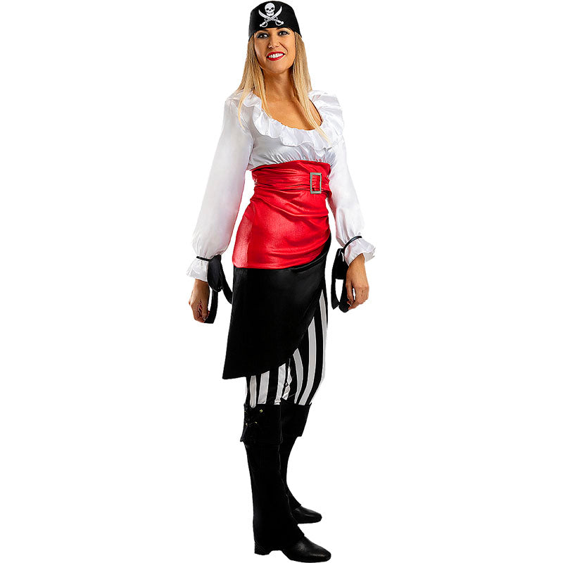 Ce costume exclusif de Pirate aventurière pour femmes contient : Robe avec écharpe, jambières, bandana et couvre-bottes | Ce déguisement de femme pour se transformer en Pirate classique d'aventures sur les océans est disponible en 4 tailles différentes