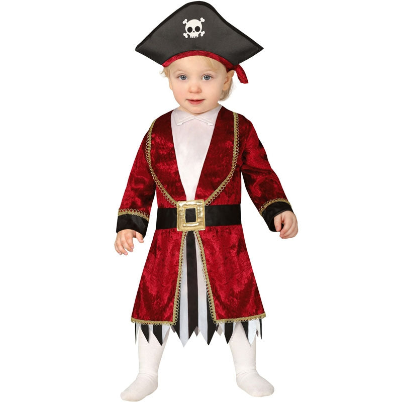 Le costume original Pirate Caribbean pour bébés contient : coiffe et tunique | Cette tenue bébé imitant Jack Sparrow est disponible en 2 tailles différentes