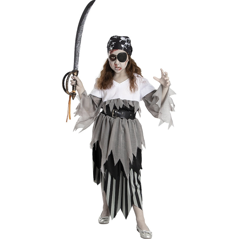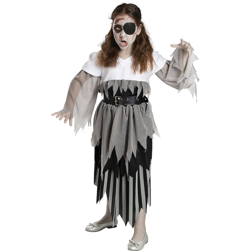 Le costume original Pirate Zombie pour filles comprenant : Robe, ceinture et cache-œil | Cette tenue fille imitant une Pirate morte-vivante zombie est disponible en 4 tailles différentes
