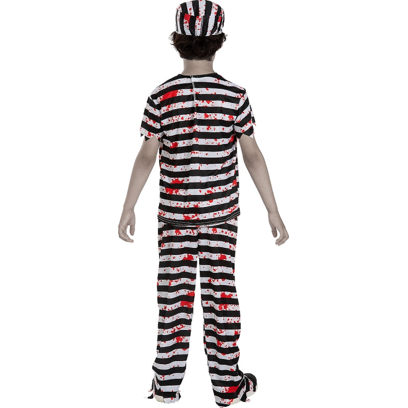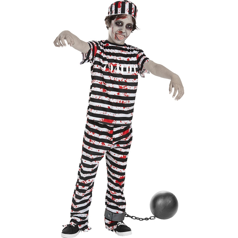 Le costume exclusif de Prisonnier Zombie Ensanglanté pour enfants comprend : Pantalon, t-shirt et bonnet | Ce tenue d'enfant imitant Prisonnier zombie ensanglanté est disponible en 4 tailles différentes.