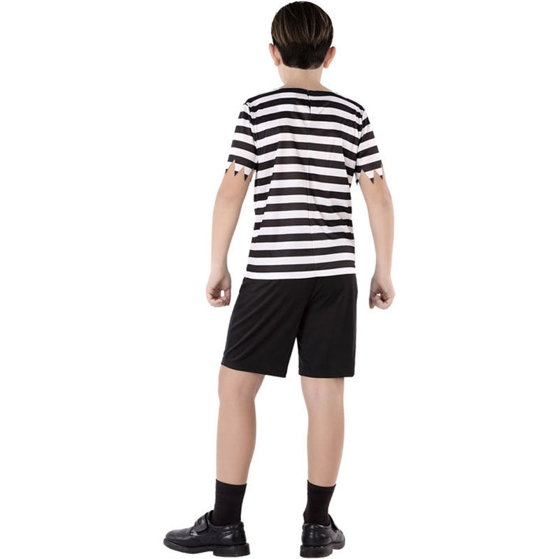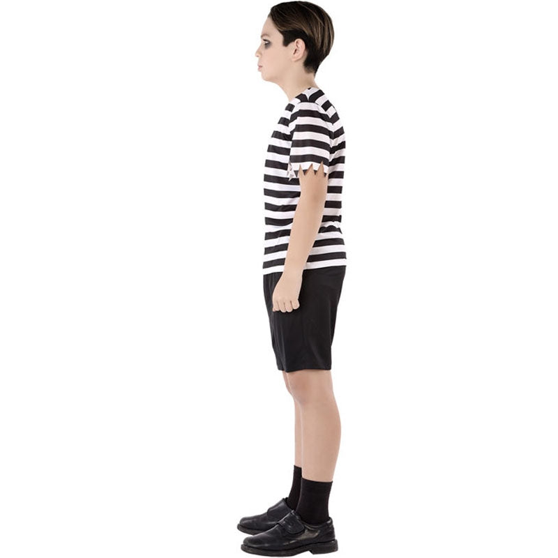 Le costume Halloween Pugsley Addams à manches courtes pour garçons contient: T-shirt et pantalon | Cette tenue terrifiante garçon imitant un Pugsley, le fils joufflu des Addams est disponible en 4 tailles différentes