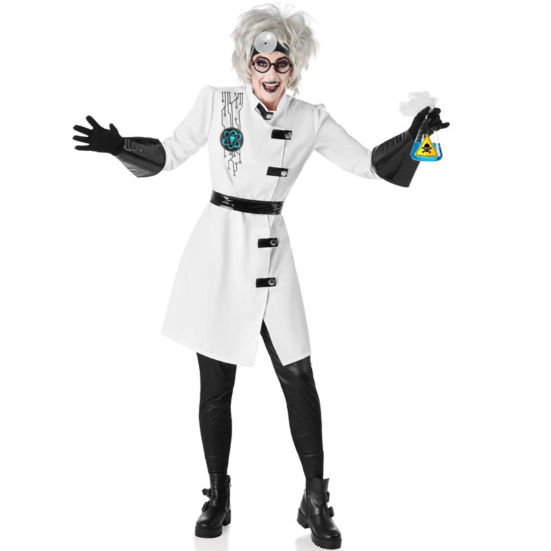 Le costume Halloween Scientifique Folle pour femmes contient : veste, pantalon, coiffe, ceinture et gants | Cette tenue sinistre femme imitant une docteur folle est disponible en taille unique