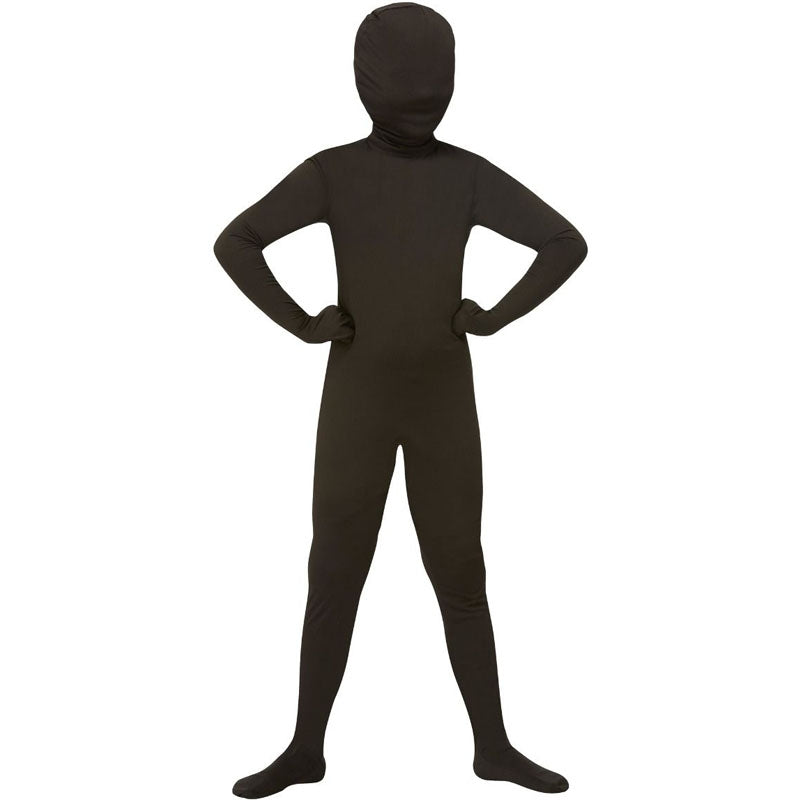 Le costume garçon zentai seconde peau couleur noir comprend la combinaison élastique couvrant le corps, mains, pieds et tête | Cette combinaison noire seconde peau est disponible en 3 tailles différentes