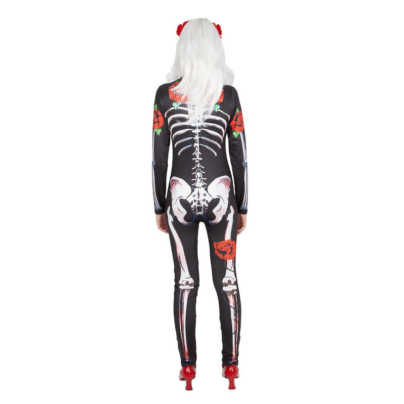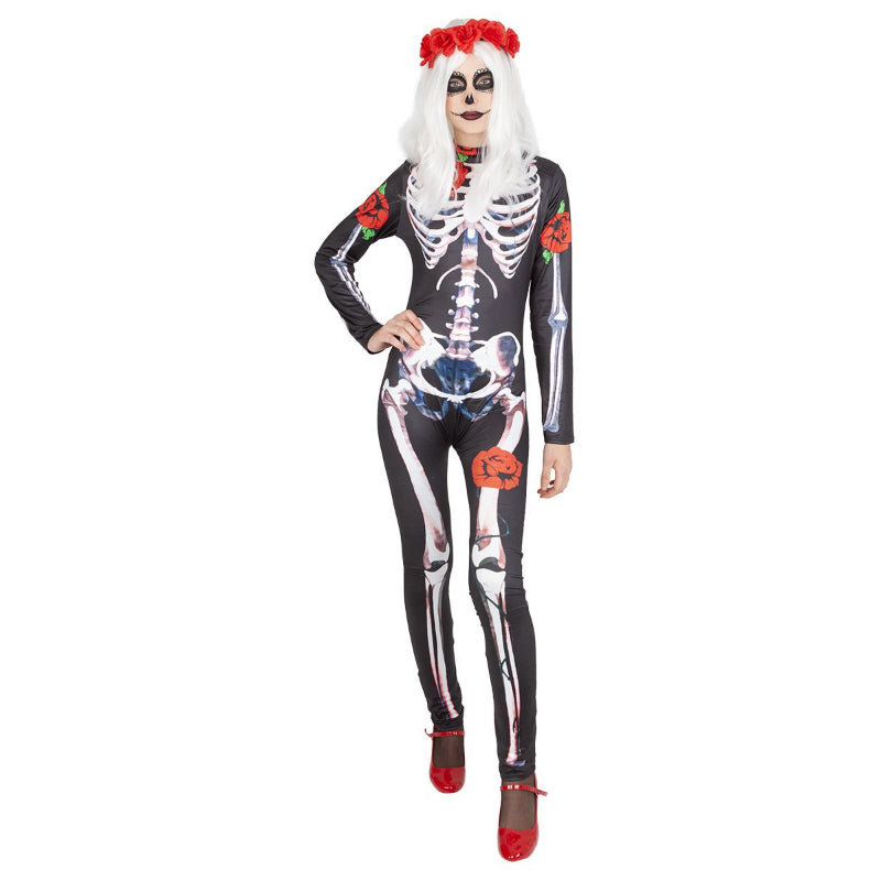 Le costume Halloween Skelita Catrina avec des roses pour femmes contient : Combinaison et diadème | Cette tenue sinistre femme imitant une Catrina avec des roses est disponible en taille unique