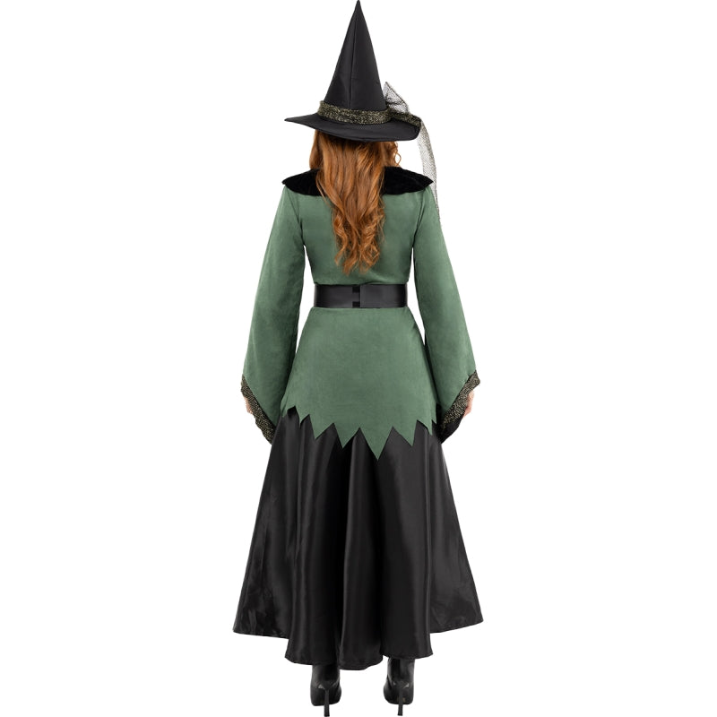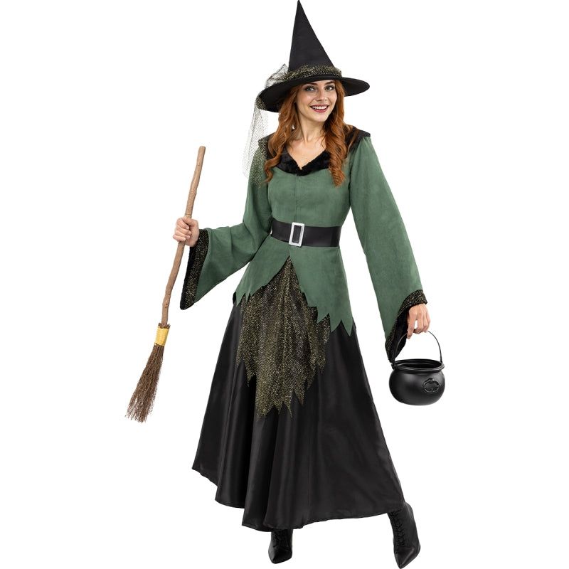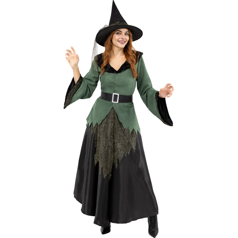 Ce costume exclusif de Sorcière deluxe pour femmes contient : Veste, jupe, ceinture et chapeau avec nœud | Ce déguisement de femme pour se transformer en sorcière d’élite au chapeau pointu et à l’aura puissante est disponible en 5 tailles différentes