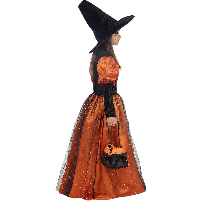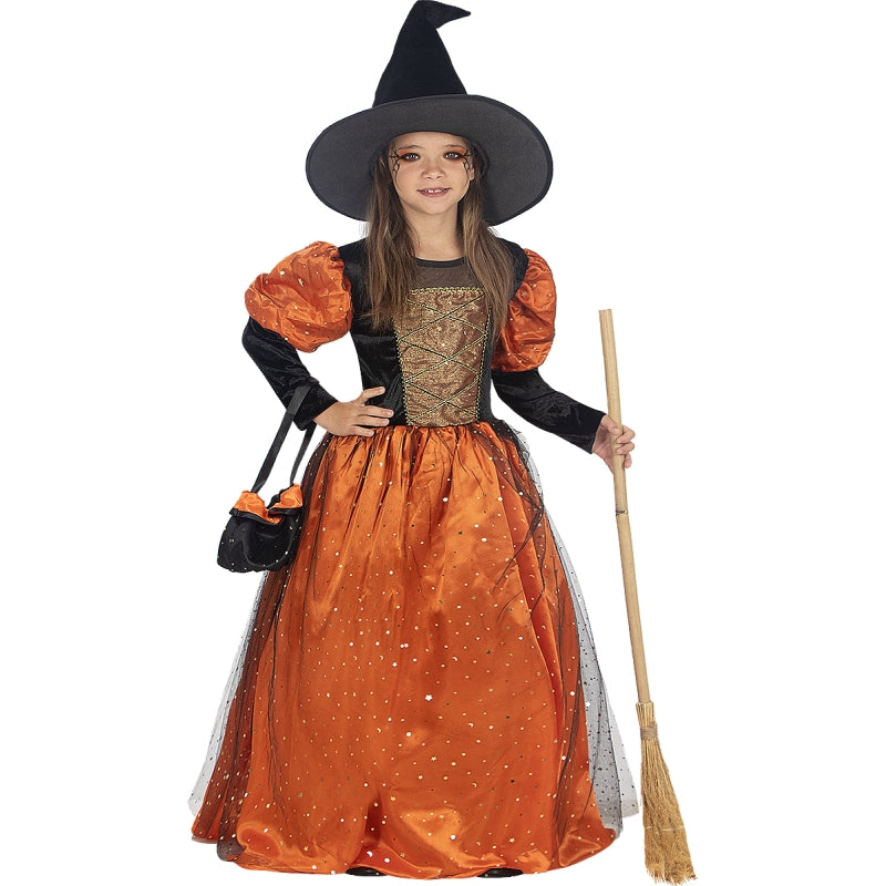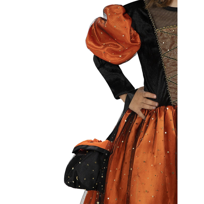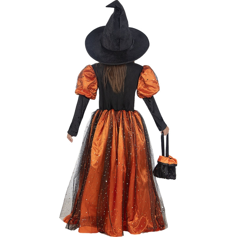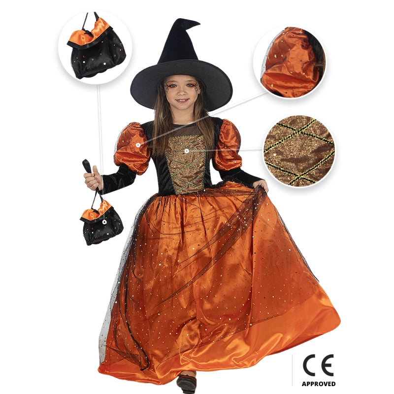 Le costume original Sorcière Premium pour filles comprenant : Robe, chapeau et sac | Cette tenue fille imitant une Sorcière Premium avec détails est disponible en 4 tailles différentes
