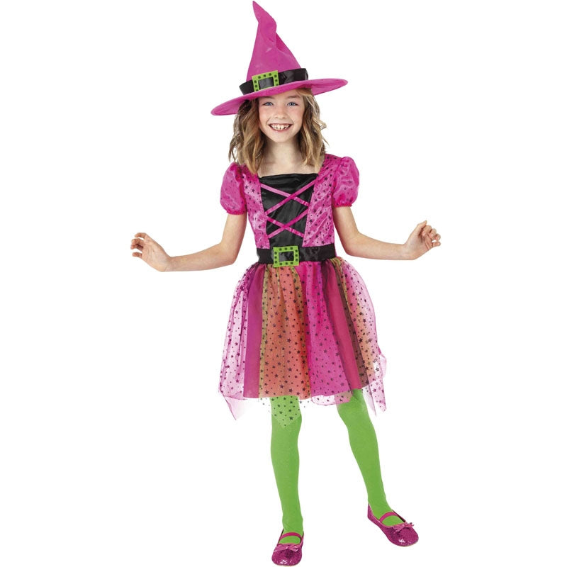 Le costume Halloween Sorcière Superstar rose pour filles contient: robe et chapeau | Cette tenue effrayante fille imitant une sorcière rose pailletée est disponible en 3 tailles différentes
