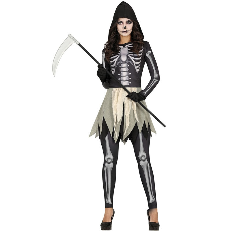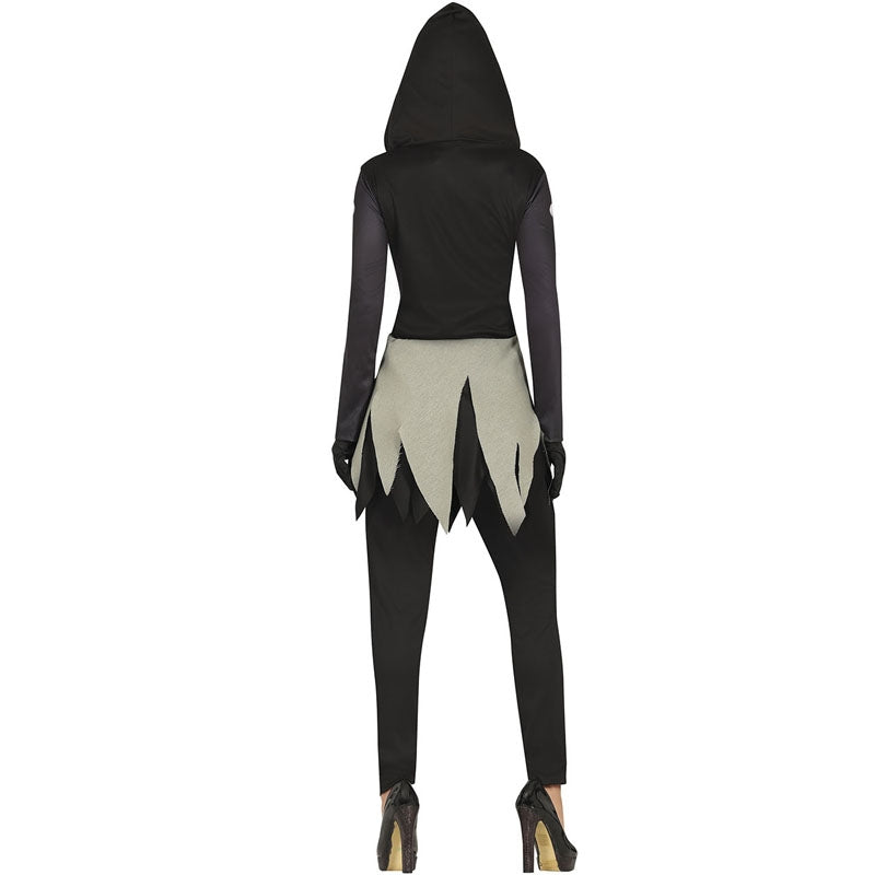 Le costume Halloween Squelette avec chiffons pour femmes contient : robe à capuche et pantalon | Cette tenue sinistre femme imitant une squelette classique avec finitions en lambeaux est disponible en 3 tailles différentes