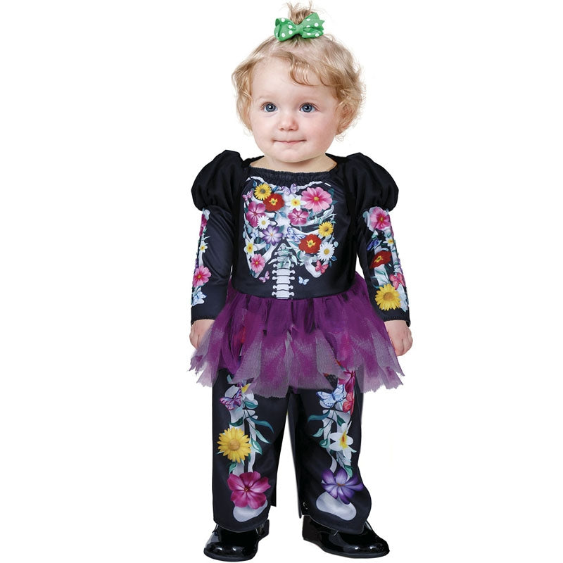 Le costume Halloween Squelette avec des fleurs pour bébés contient : combinaison | Cette tenue bébé horrifiante imitant un Squelette mexicain plein de fleurs colorées est disponible en 2 tailles différentes