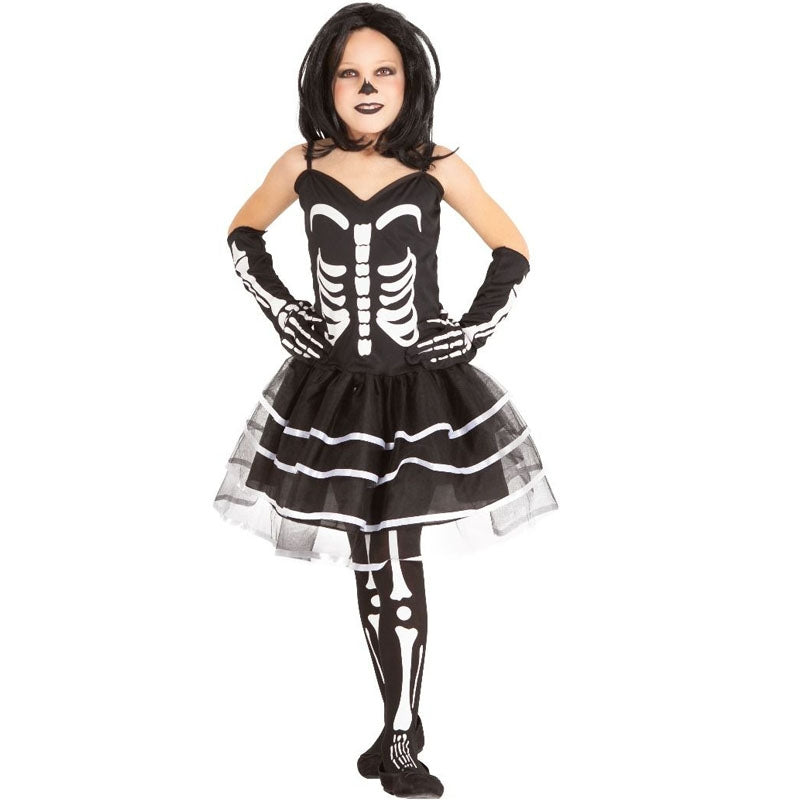 Le costume Halloween Squelette Miss Bones pour filles contient: robe, bas et moufles | Cette tenue effrayante fille imitant une squelette est disponible en 3 tailles différentes