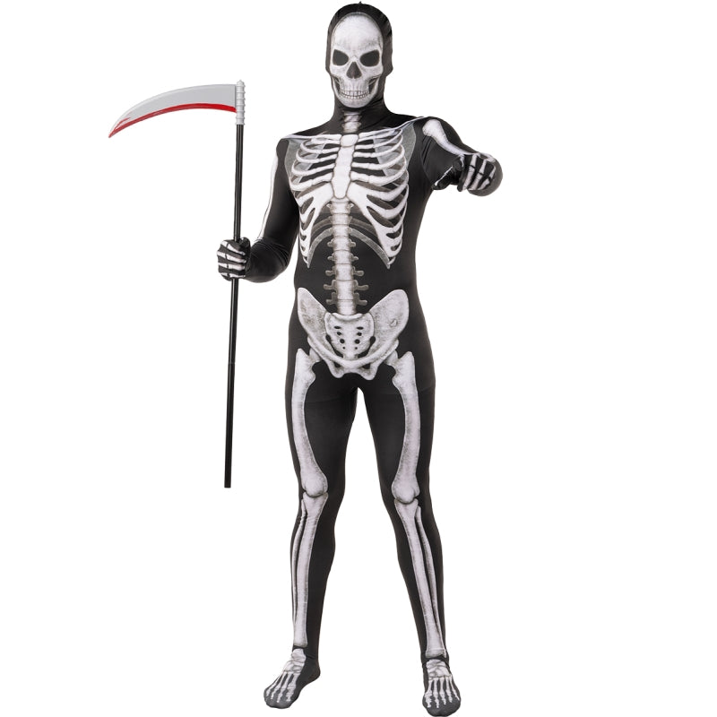 Costume de squelette de la mort pour homme avec combinaison intégrale effet seconde peau et ouverture à l’arrière. Disponible en 5 tailles. Faux sabre non inclus. Idéal pour un look terrifiant et réaliste.