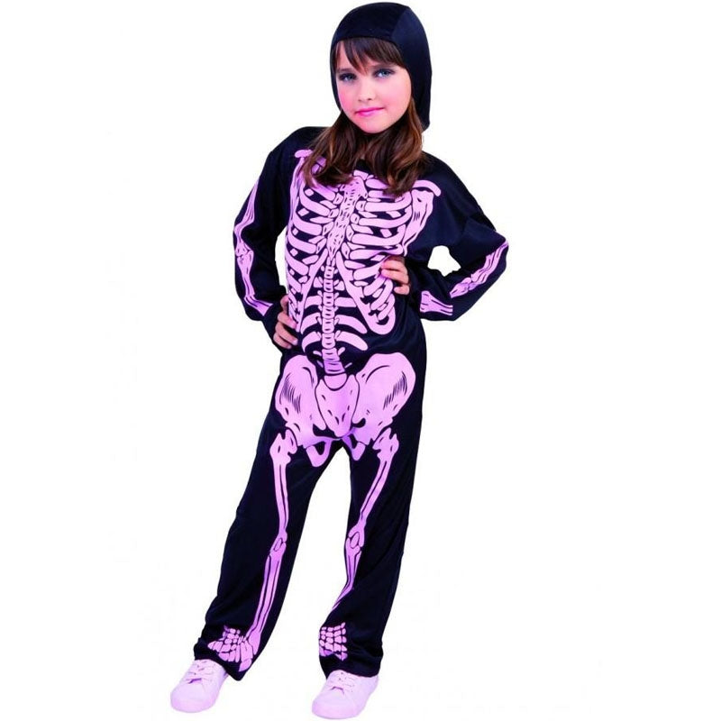 Le costume Halloween Squelette avec os roses pour filles comprenant : combinaison et capuche | Cette tenue effrayante fille imitant une Squelette jour des morts est disponible en 3 tailles différentes