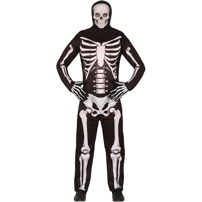 Le costume Halloween Squelette réaliste ppour hommes contient : combinaison et capuche | Cette tenue horrifique adulte imitant un Squelette avec os est disponible en 2 tailles différentes