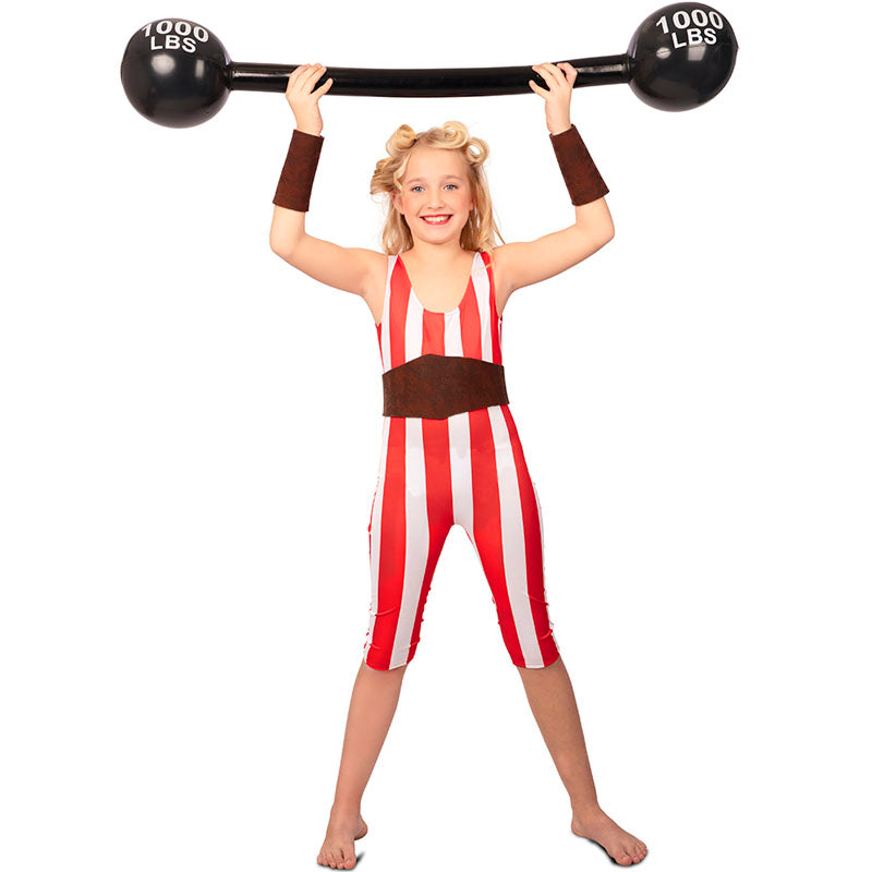 Le costume original Strongwoman rayée du cirque pour filles comprenant : Combinaison, ceinture et bracelets | Cette tenue fille imitant une strongwoman vintage est disponible en 3 tailles différentes