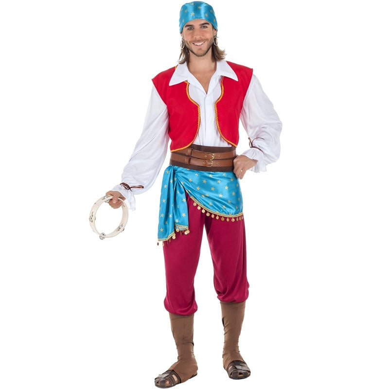 Le costume adulte imitant un tzigane Devin pour hommes contient: bandana, chemise, gilet, ceintures, pantalon et surbottes| Ce déguisement homme tzigane voyant est disponible en 3 tailles différentes