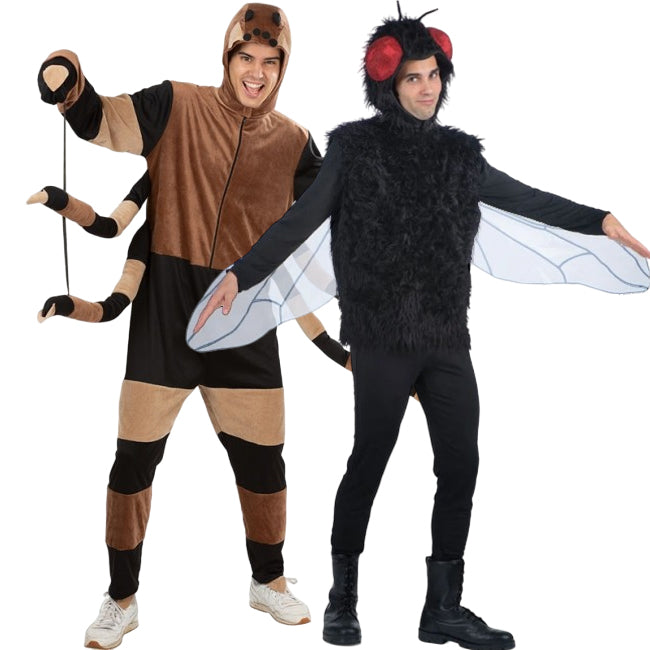 Le costume d'araignée adulte comprend : une combinaison, un couvre-chef et des moufles, tandis que le costume de mouche noire pour homme comprend : une chemise avec des ailes et un chapeau.