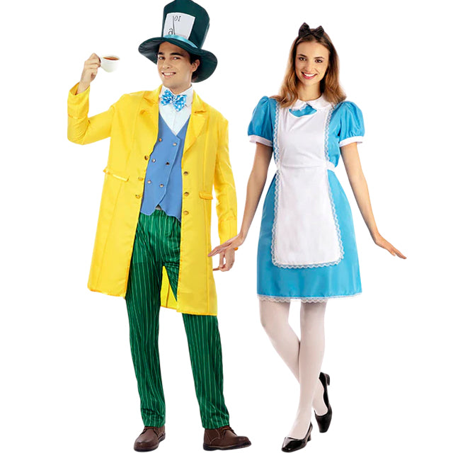 Le costume du Chapelier Fou du film Alice pour hommes comprend : chapeau, chemise avec faux gilet, veste, pantalon et nœud papillon, tandis que le costume de Princesse Alice pour femmes contient : robe avec tablier et diadème.