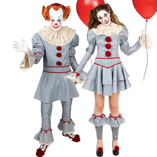 Le costume de Clown du Chapitre 2 de IT pour homme comprend : une chemise à manches longues et un pantalon avec garniture, un col et deux pompons décoratifs avec pinces à chaussures, tandis que le costume de Clown du Chapitre 2 de IT pour femme comprend : une robe, un col, des jambières et deux pompons décoratifs avec pinces à chaussures.