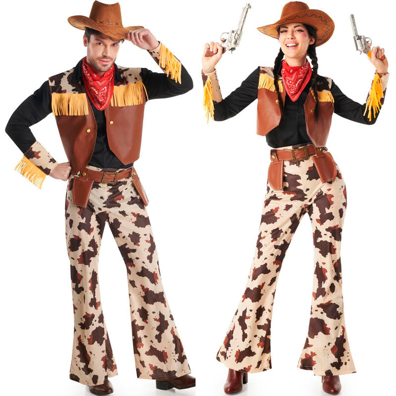 Le déguisement Cow-boy Rancho Fuerte pour homme comprend : gilet, pantalon, ceinture avec cartouchières, manchettes et foulard, tandis que le déguisement Cow-girl Rancho Fuerte pour femme contient : gilet, pantalon, ceinture avec cartouchières, manchettes et foulard.