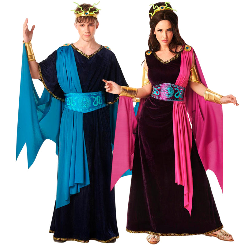 Le déguisement Grec Méduse pour homme comprend : robe avec cape, ceinture, bracelets et diadème, tandis que le déguisement Grecque Méduse pour femme contient : robe avec cape, ceinture, manchettes, bracelets et diadème.
