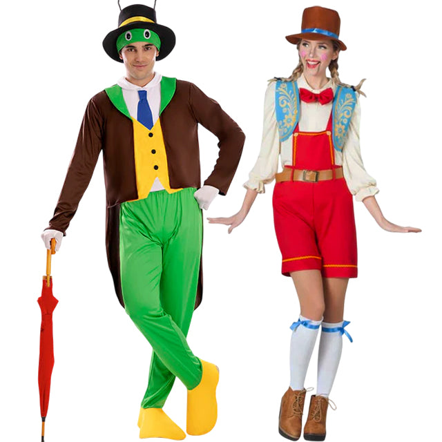Le costume du Grillon du conte de Pinocchio pour hommes comprend : pantalon, veste avec chemise simulée et chapeau, tandis que le costume d’adulte pour se transformer en la marionnette Pinocchio pour femmes comprend : chapeau, gilet, chemise avec nœud papillon, salopette, ceinture et rubans pour les jambes.
