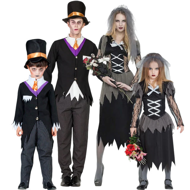 Fantastique idée pour déguiser toute la famille en Mariés Cadavériques avec des designs assortis pour homme, femme, garçon et fille. Vous pouvez accéder au contenu de chaque costume plus bas dans la section « Complétez votre look », où figure chaque costume appartenant individuellement à ce groupe.