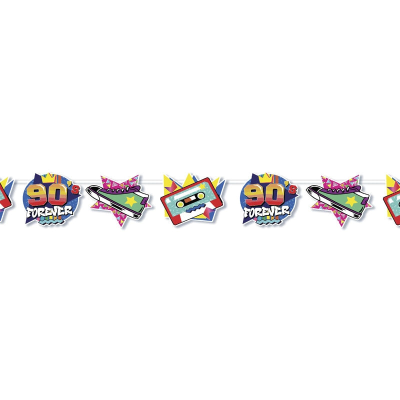 La Guirlande Thématique Années 90 de 3 mètres est la touche originale parfaite pour compléter la décoration de manière voyante et colorée lors de tout événement costumé ou fête d'anniversaire