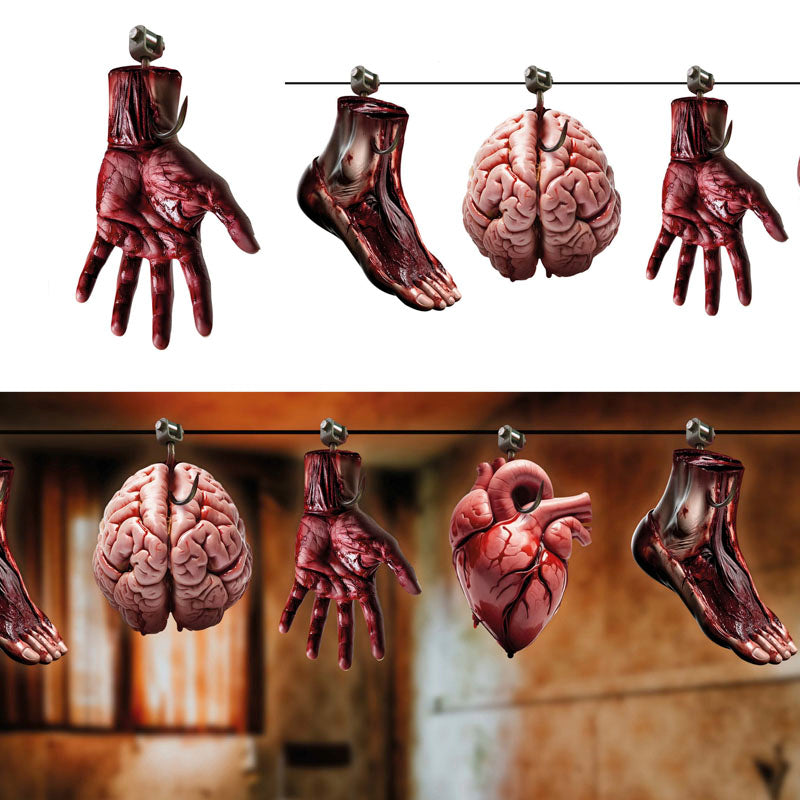 El diseño incluye manos, pies, cerebros y corazones ensangrentados colgados en ganchos, simulando una auténtica carnicería humana. Perfecta para ambientar casas encantadas, pasillos de miedo o fiestas temáticas de zombies y asesinos.