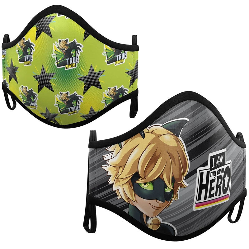 Masque hygiénique pour enfants en tissu lavable et réutilisable, avec 3 couches et design Cat Noir. Ce lot de 2 masques de protection pour enfants est disponible en 2 tailles différentes.