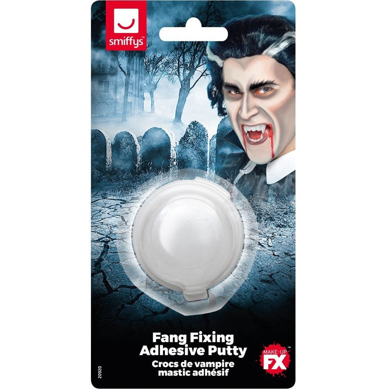 Achetez le mastic fang fixateur et vous pouvez porter votre look Dracula tout au long de la soirée Halloween, même au souper, car ce produit vous permet de fixer les fausses dents des vampires confortablement sur vos dents.
