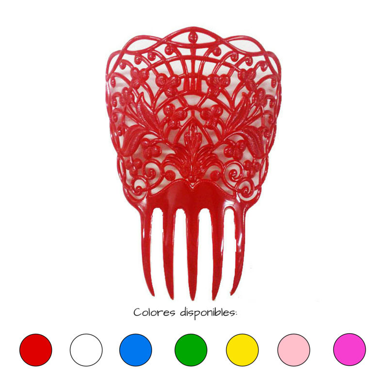 Ce peigne à mantille sévillane original est sans aucun doute l’accessoire flamenco qui ne peut pas échouer en cas de vous déguiser lors d’une soirée ou fête Flamenco. La connue Feria de Abril à la ville de Séville, un spectacle de danse flamenco, un pèlerinage, une fête à thème costumes flamenco, ou tout simplement un enterrement de vie de jeune fille... il y a plein d’évènements où se déguiser en Flamenco ou cordouane avec une robe sévillane, c’est une bonne idée pour se déguiser. Vous ne pouvez pas manquer dans votre costume flamenco le peigne à mantille disponible en plusieurs couleurs que nous offrons. Combinez ce peigne à mantille sévillane avec votre costume pour rendre la tenue superbe. Choisissez entre jaune, bleu, blanc, fuchsia, rouge, rose et vert, sans aucun doute ce peigne à mantille flamenco sera l’accessoire parfait pour votre robe flamenco.