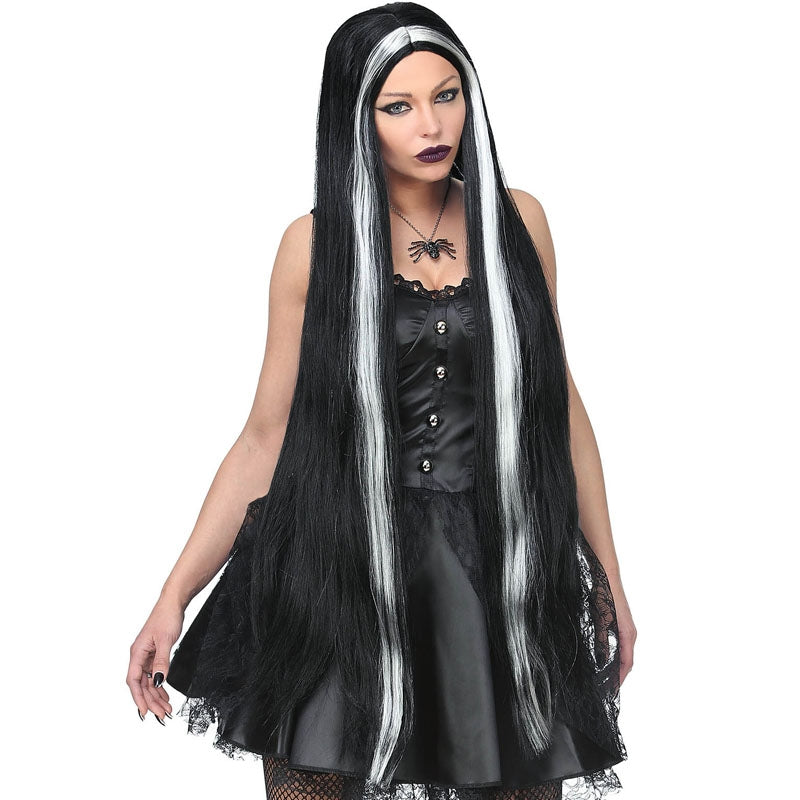 Perruque noire extra longue avec mèches blanches est la touche terreur parfaite pour compléter votre costume Halloween de manière frappante et colorée lors de tout événement déguisé ou soirée costumée horrifiante.