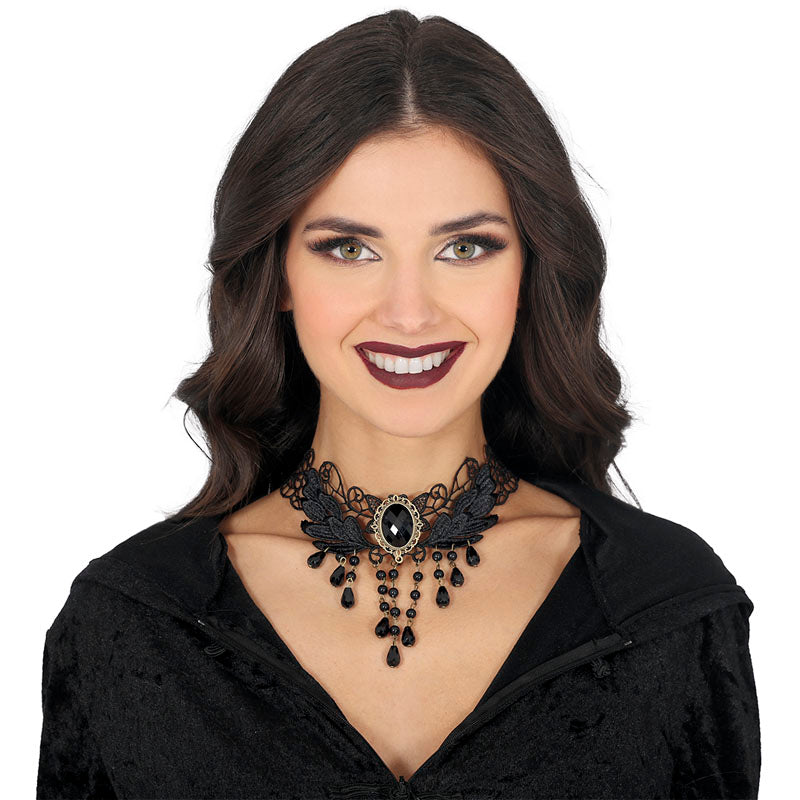 Ras-de-cou brodé avec pierres noires est la touche terreur parfaite pour compléter votre costume Halloween de manière frappante et colorée lors de tout événement déguisé ou soirée costumée horrifiante.